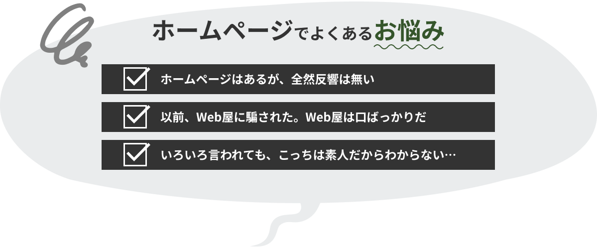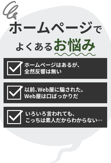 もうすでにホームページをお持ちの方は、リニューアルの前に、今のホームページが反響が出ていない理由、改善案などをご確認いただくことをオススメします。